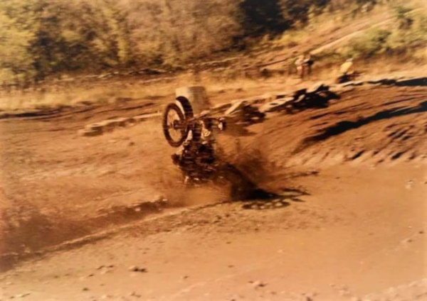 1981 - Wheelieing thorough a small pond that formed on the rain-soaked Millville track